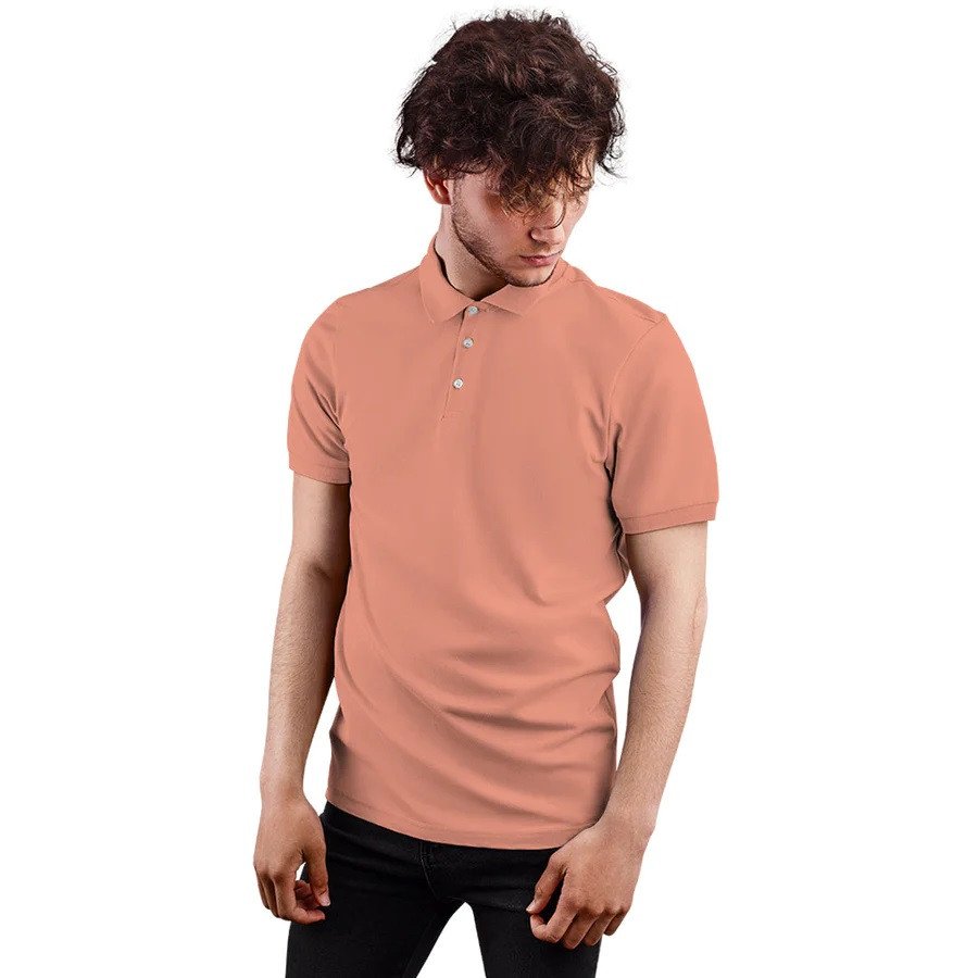 Featuring a classic polo neck design, this T-shirt combines modern style with casual elegance. Its peach color adds a fresh, vibrant look, making it perfect for casual outings, office wear, semi-formal occasions, or leisure activities.