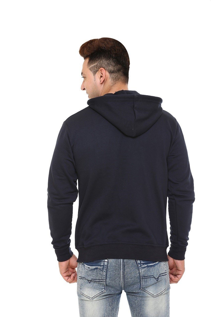 The deep navy blue color gives a classic and versatile look that pairs effortlessly with jeans, joggers, or casual trousers. Featuring a full front zipper, adjustable drawstring hood, and ribbed cuffs and hem, this hoodie provides a snug fit while maintaining a sleek and contemporary style.