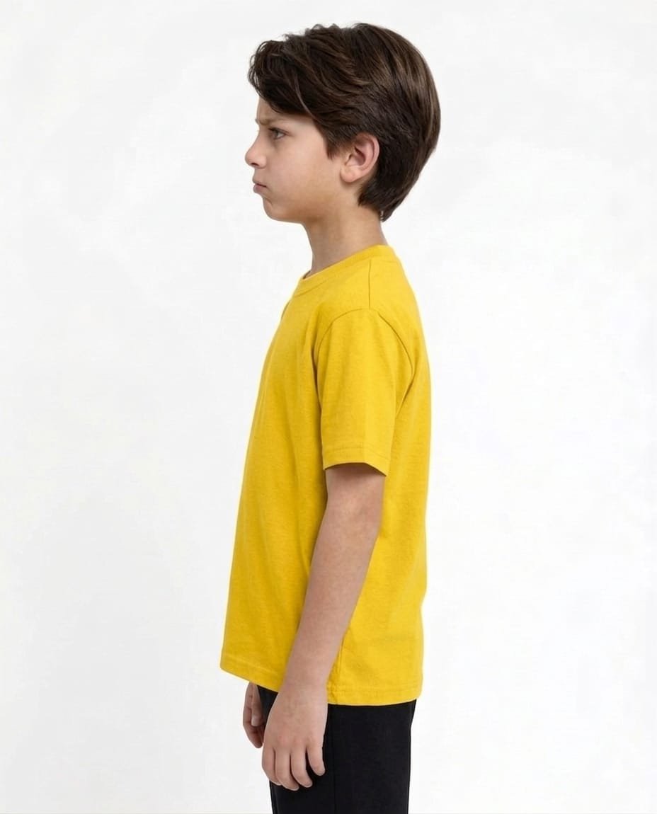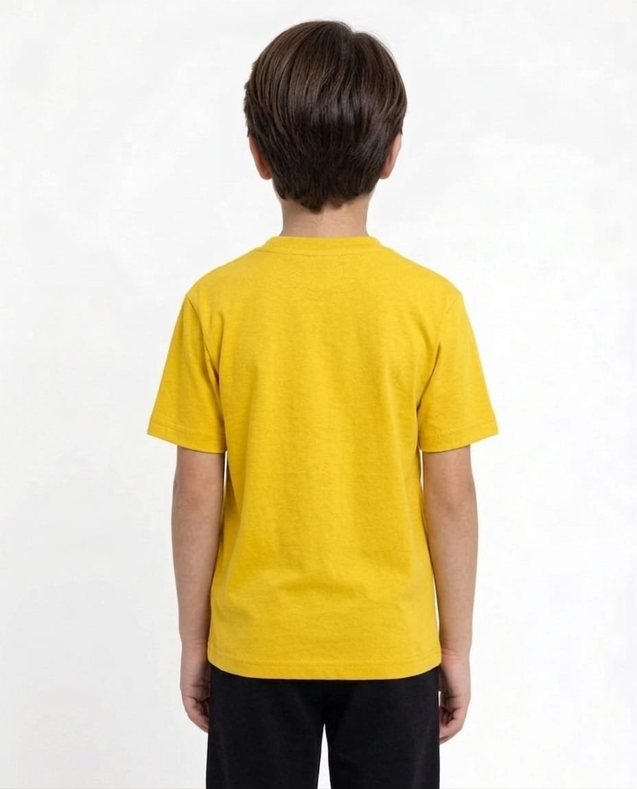 Yellow round neck 180 GSM cotton T-shirt for kids, made from premium quality breathable cotton fabric that is soft and gentle on delicate skin, designed to provide maximum comfort for all-day wear, 180 GSM fabric ensures durability while maintaining a lightweight and airy feel, classic round neck design gives a neat and timeless casual look, bright yellow color adds a cheerful and vibrant touch to kids’ wardrobe, perfect for school, playtime, outings or relaxing at home, smooth texture helps prevent skin irritation and keeps kids comfortable throughout the day, easy to pair with jeans, shorts or joggers for a stylish casual outfit, colorfast fabric retains brightness even after repeated washes, reinforced stitching enhances durability for active kids, skin-friendly and hypoallergenic material suitable for sensitive skin, available in multiple sizes for growing children, easy to maintain with regular machine wash, quick drying and low maintenance, suitable for both boys and girls, a perfect combination of comfort, style and everyday practicality, an essential piece for kids fashion