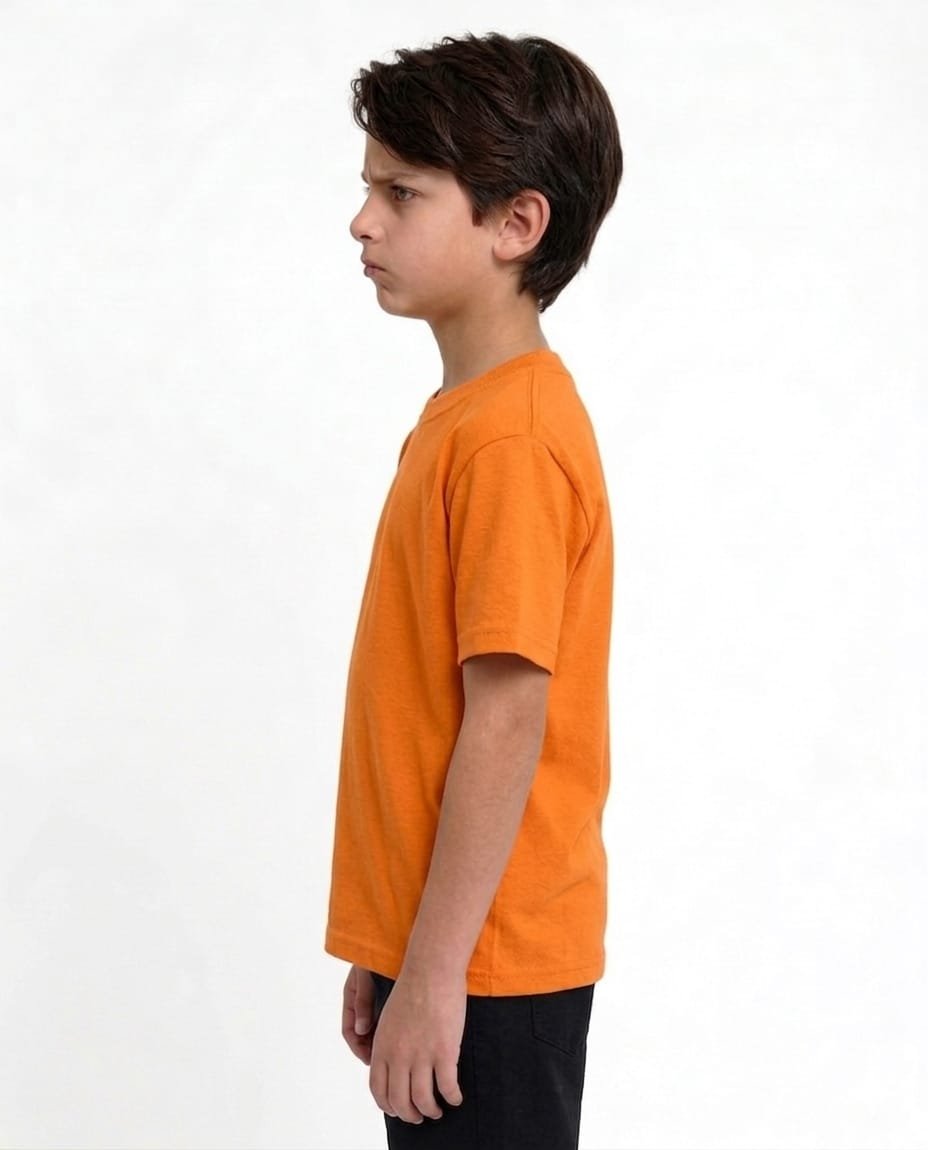 Orange round neck 180 GSM cotton T-shirt for kids, made from premium quality breathable cotton fabric that is soft and gentle on delicate skin, designed to provide superior comfort for all-day wear, 180 GSM fabric ensures durability while maintaining a lightweight and airy feel, classic round neck design offers a clean and timeless casual look, vibrant orange color adds a bold and energetic touch to kids’ wardrobe, perfect for school, playtime, outings or relaxing at home, smooth texture helps prevent skin irritation and keeps kids comfortable throughout the day, easy to pair with jeans, shorts or joggers for a stylish casual outfit, colorfast fabric retains its brightness even after multiple washes, reinforced stitching enhances durability for active kids, skin-friendly and hypoallergenic material suitable for sensitive skin, available in multiple sizes for growing children, easy to maintain with regular machine wash, quick drying and low maintenance, suitable for both boys and girls, a perfect combination of comfort, style and practicality, an essential addition to everyday kids fashion