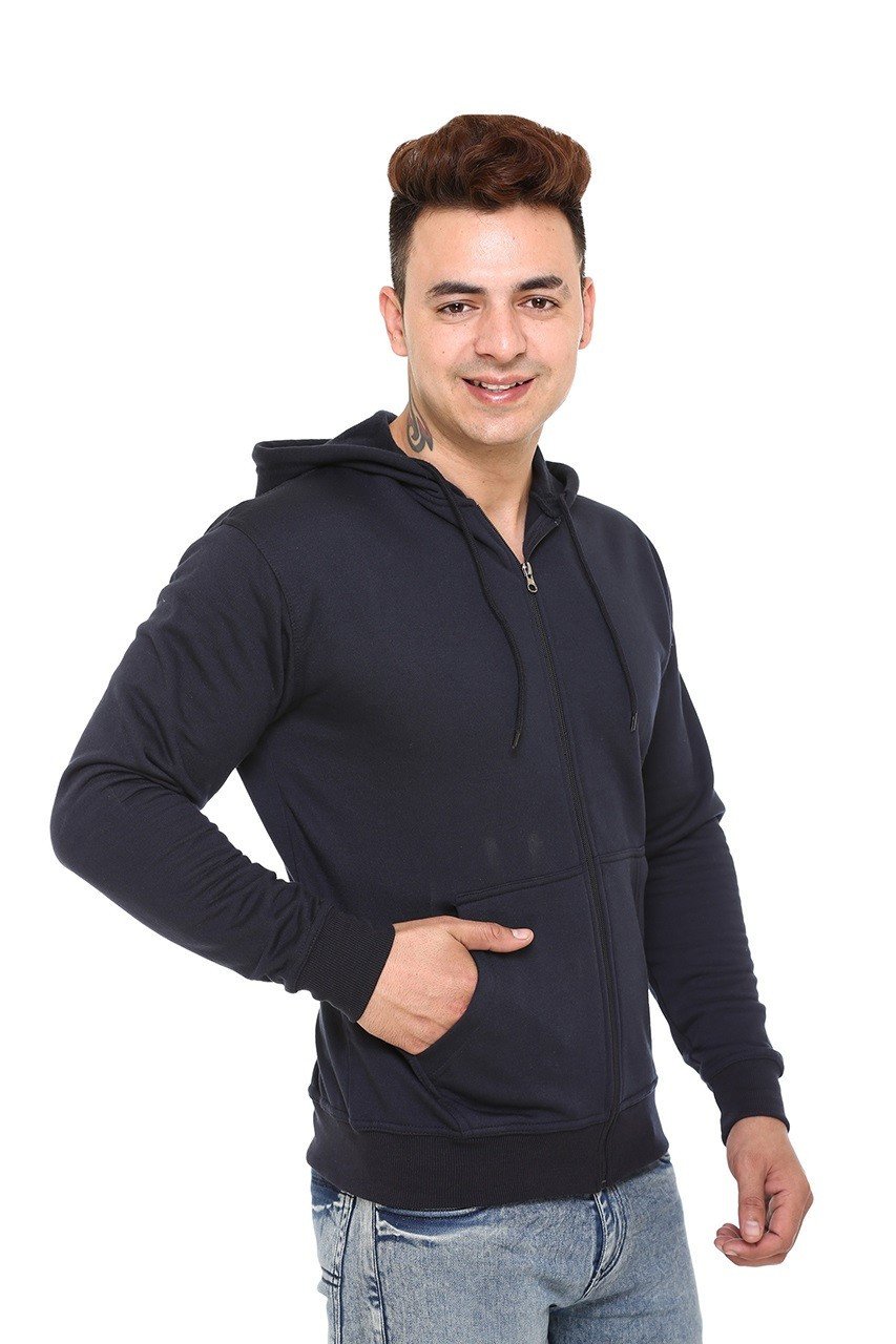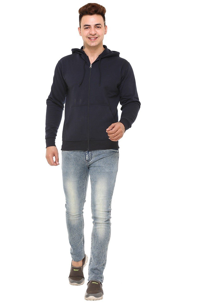 The deep navy blue color gives a classic and versatile look that pairs effortlessly with jeans, joggers, or casual trousers. Featuring a full front zipper, adjustable drawstring hood, and ribbed cuffs and hem, this hoodie provides a snug fit while maintaining a sleek and contemporary style.