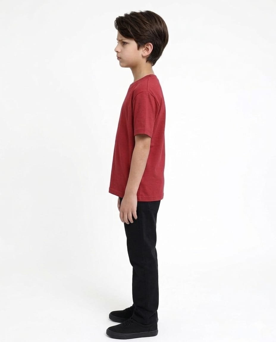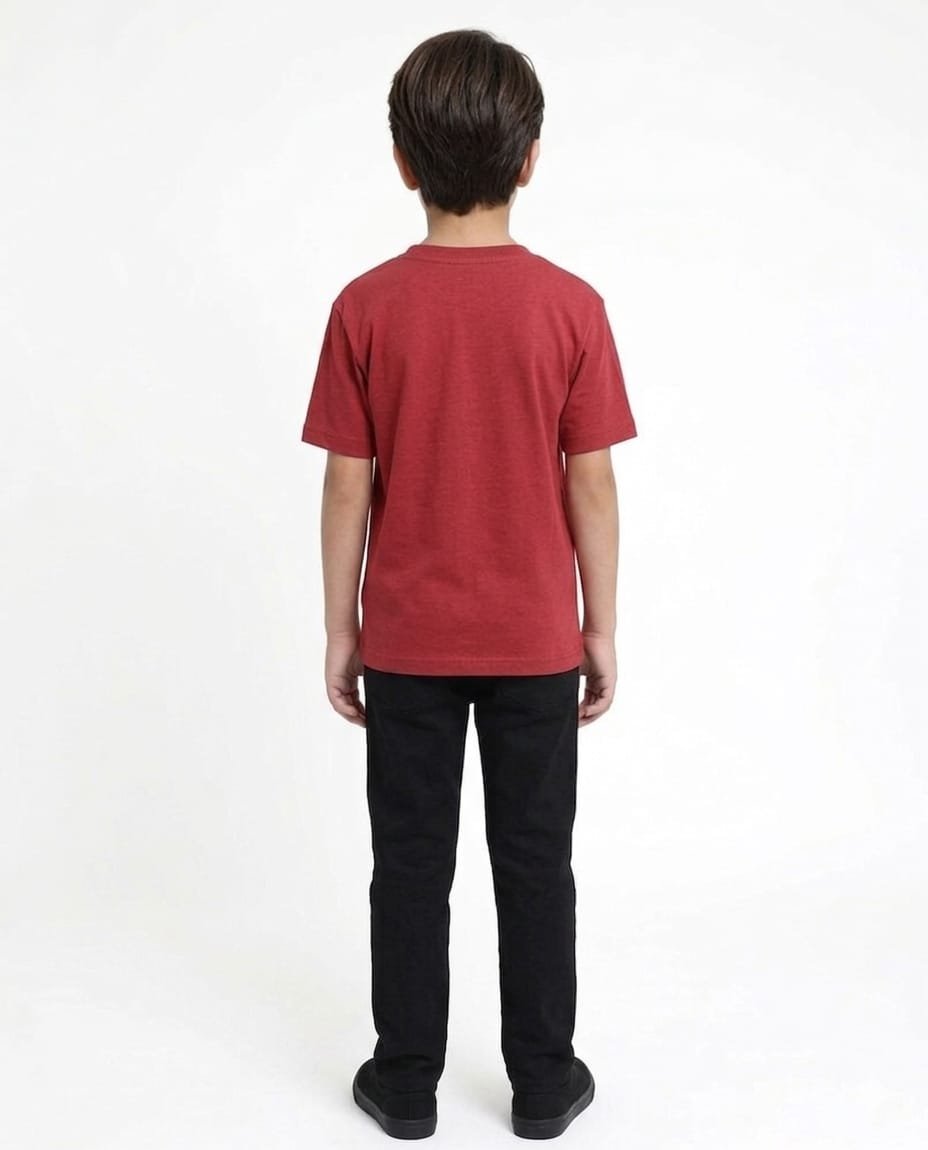 Red round neck 180 GSM cotton T-shirt for kids, made from premium quality breathable cotton fabric that feels soft and gentle on delicate skin, designed to provide all-day comfort for active children, 180 GSM fabric ensures durability while remaining lightweight and airy, classic round neck design offers a clean and stylish everyday look, vibrant red color adds a bold and energetic touch to kids’ wardrobe, perfect for school, playtime, outings or relaxing at home, smooth texture prevents irritation and keeps kids comfortable throughout the day, easy to pair with jeans, shorts or joggers for a trendy casual outfit, colorfast fabric maintains brightness even after multiple washes, reinforced stitching enhances durability for rough use, skin-friendly and hypoallergenic material suitable for sensitive skin, available in multiple sizes for growing kids, easy to maintain with regular machine wash, quick drying and low maintenance, suitable for both boys and girls, perfect combination of comfort, style and practicality, an essential addition to everyday kids fashion